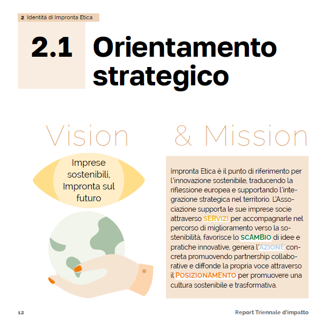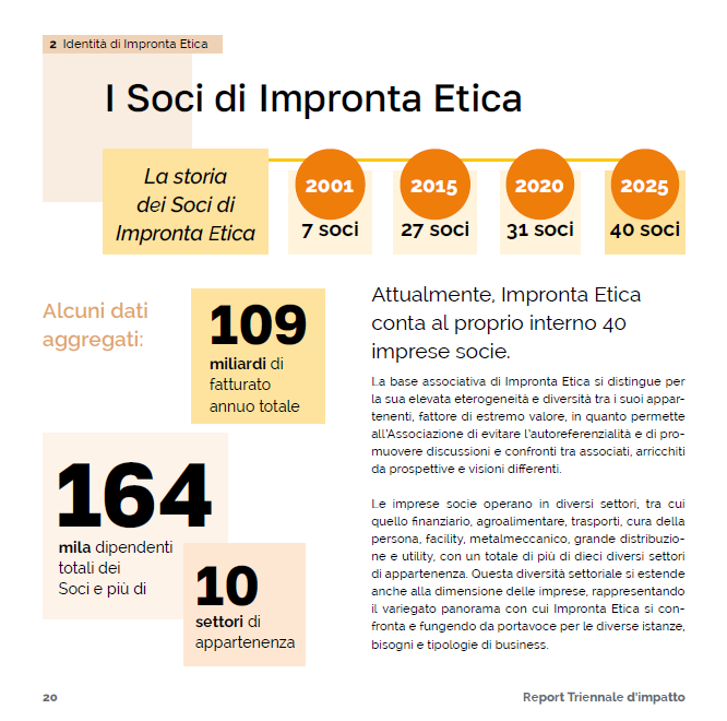 L’anno 2026 segna 25 anni di attività per Impronta Etica, un traguardo pivotale per l’Associazione che dal 2001 lavora insieme alle imprese per promuovere la sostenibilità come leva di sviluppo strategico e competitivo. Nel 2026 esce pubblicamente il nostro secondo Report di Impatto Triennale, realizzato con il supporto redazionale e grafico di SCS Consulting: un documento che vuole raccontare quanto fatto nel corso degli ultimi tre anni, quantificando il nostro impatto generato.